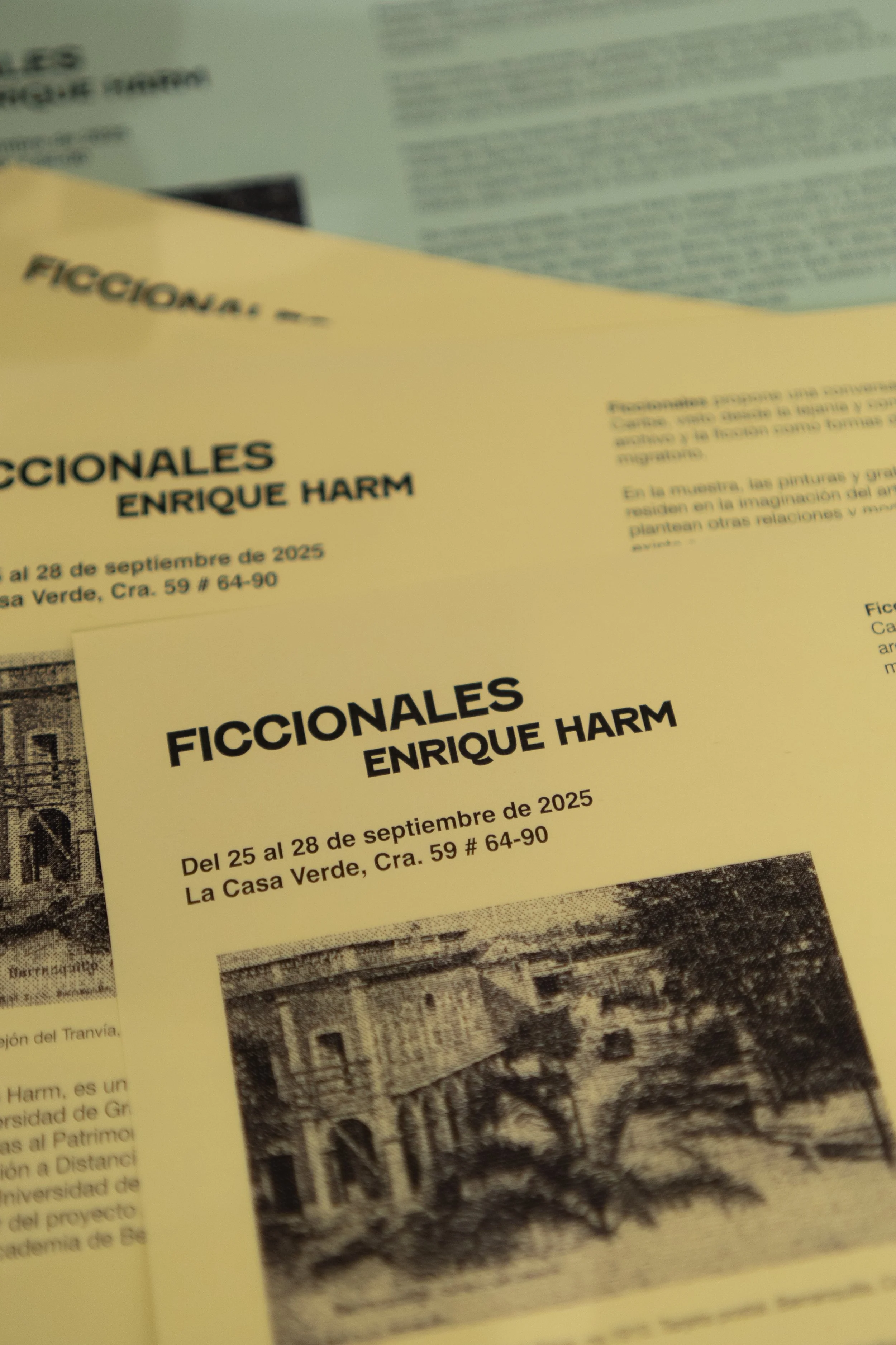 Enrique Harm presentó Ficcionales del 25 al 28 de septiembre de 2025 en La Casa Verde, en Barranquilla. En esta muestra, articuló un diálogo entre el paisaje imaginado y su archivo personal para examinar las formas de representación de las imágenes y la manera en que estas se organizan para configurar un relato ficcionado.