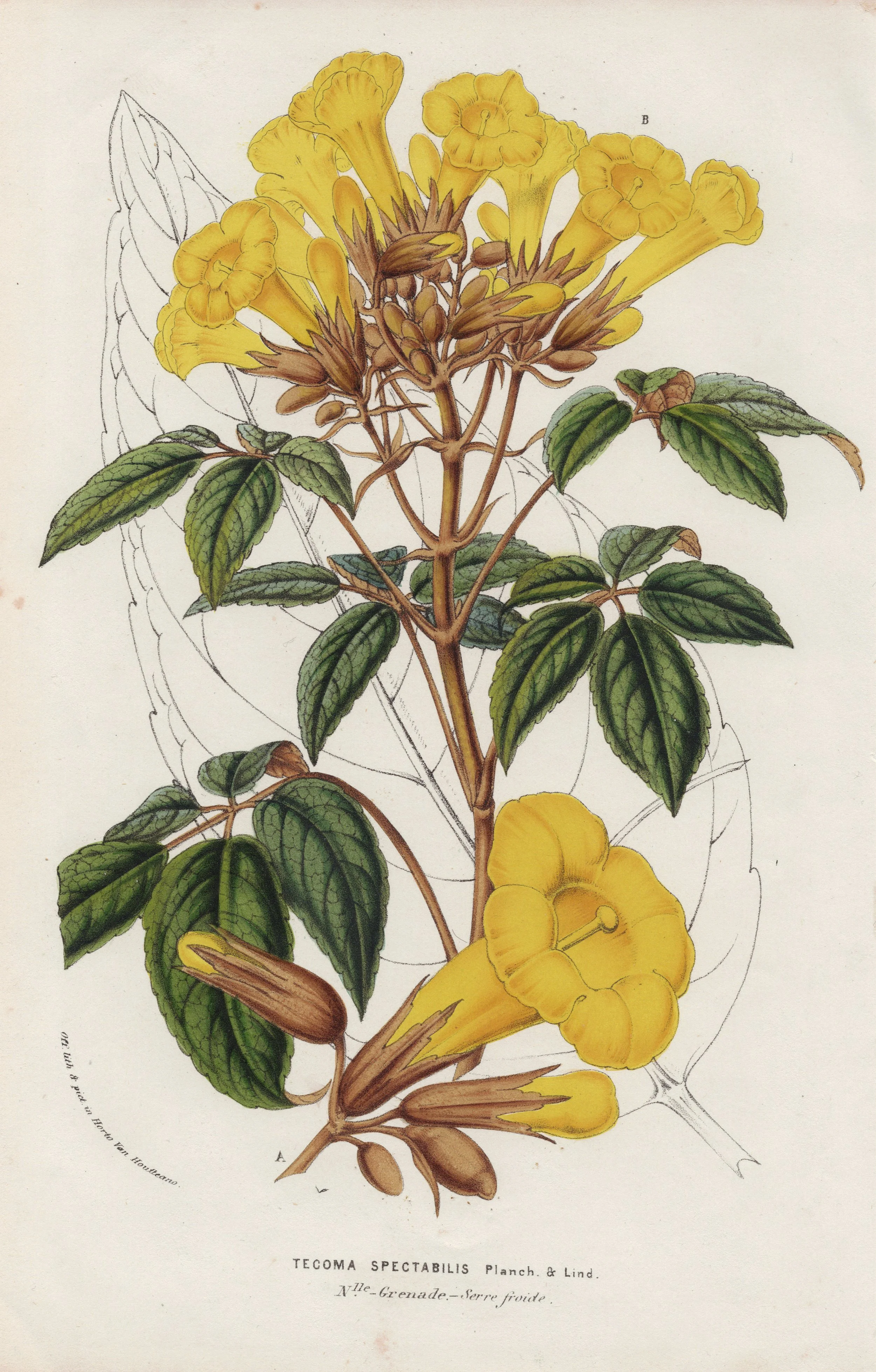 Tecoma Spectabilis, Flore des Serres et des Jardins de l'Europe. Litografia, 1850. Louis Benoit van Houtte. Fuente: Colección particular, Archivo Edita